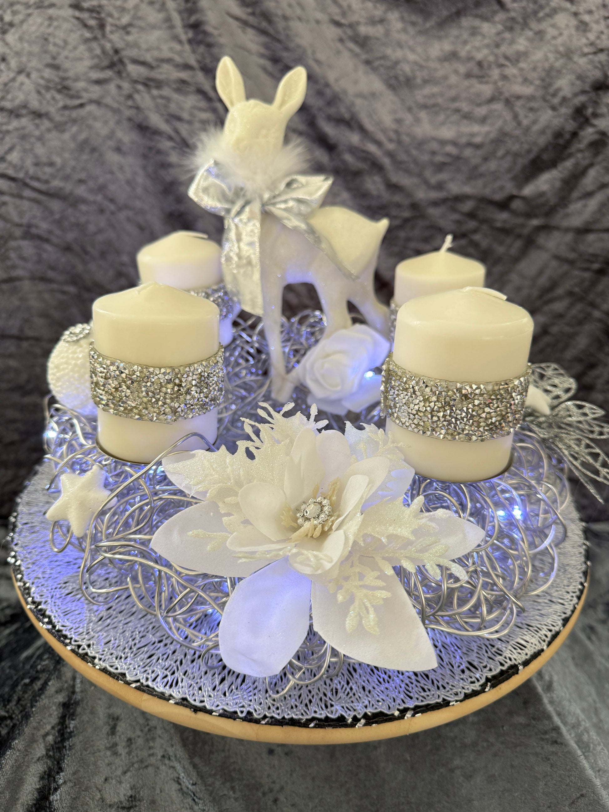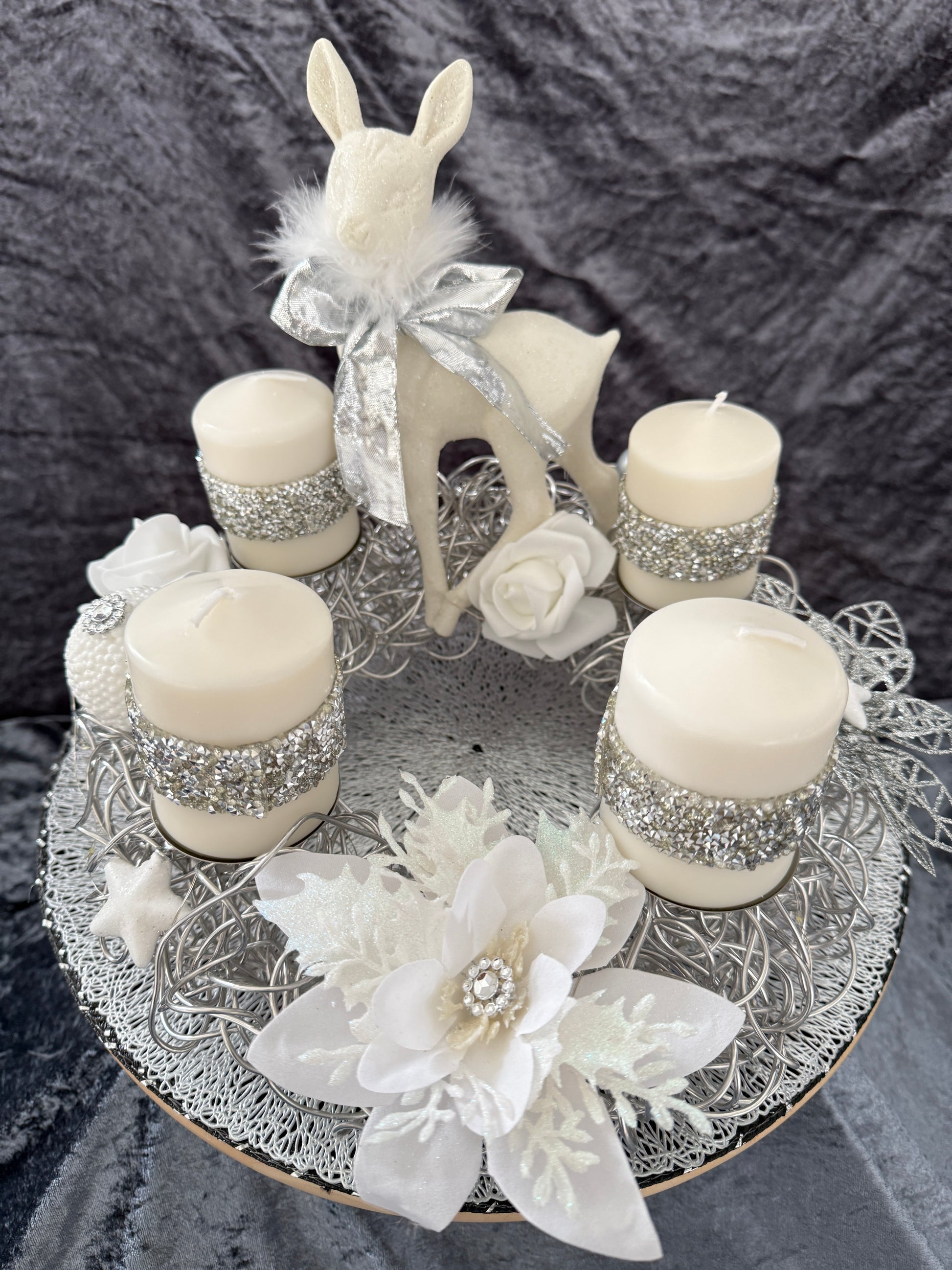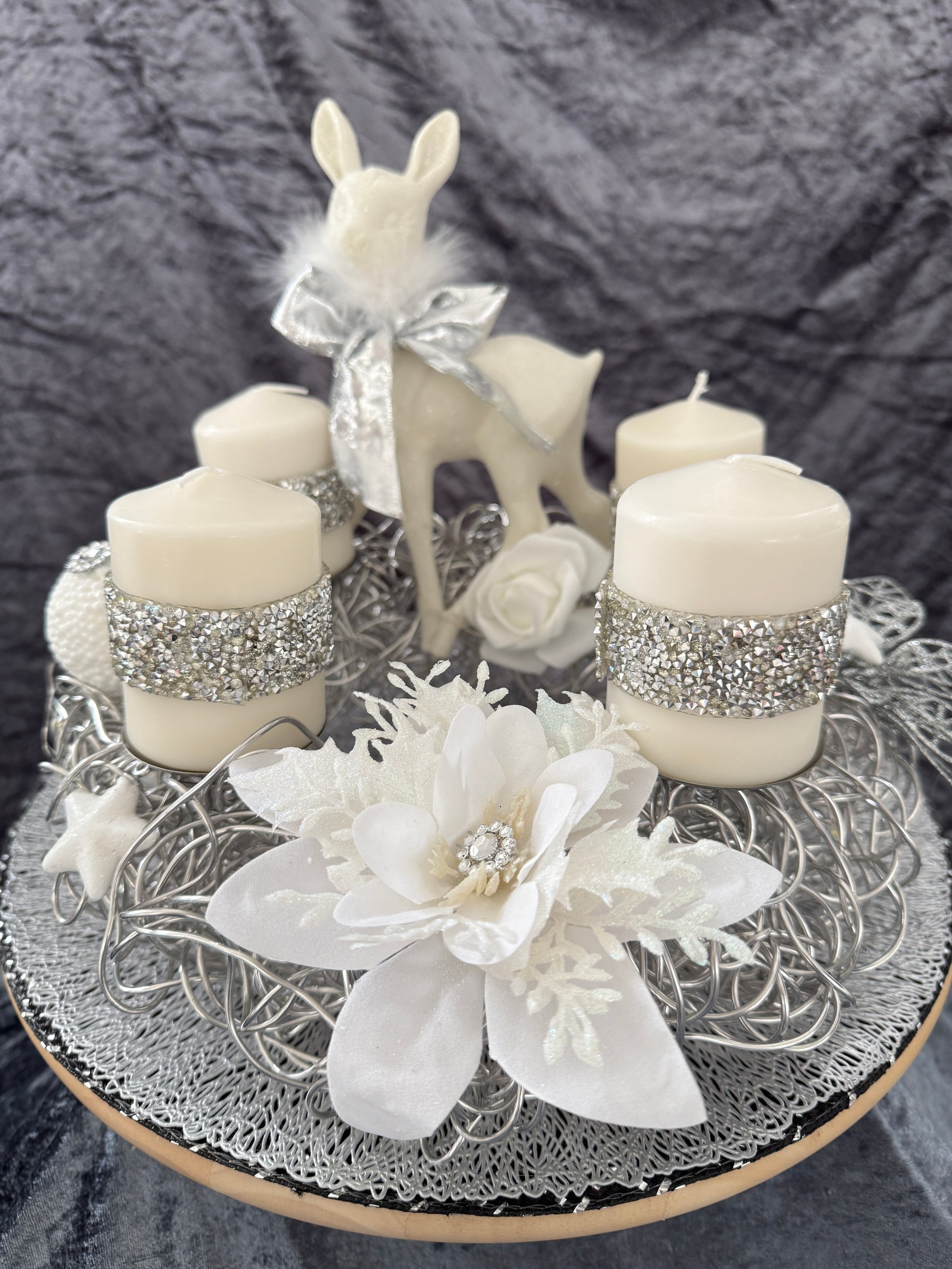 Dieser liebevoll gestaltete Adventskranz aus Aluminiumf misst ca .30 cm  und ist aus hochwertigen, Materialien hergestellt, was es zu einem langlebigen und pflegeleichten Begleiter in der Weihnachtszeit macht und jedes Jahr wieder verwendet werden kann.