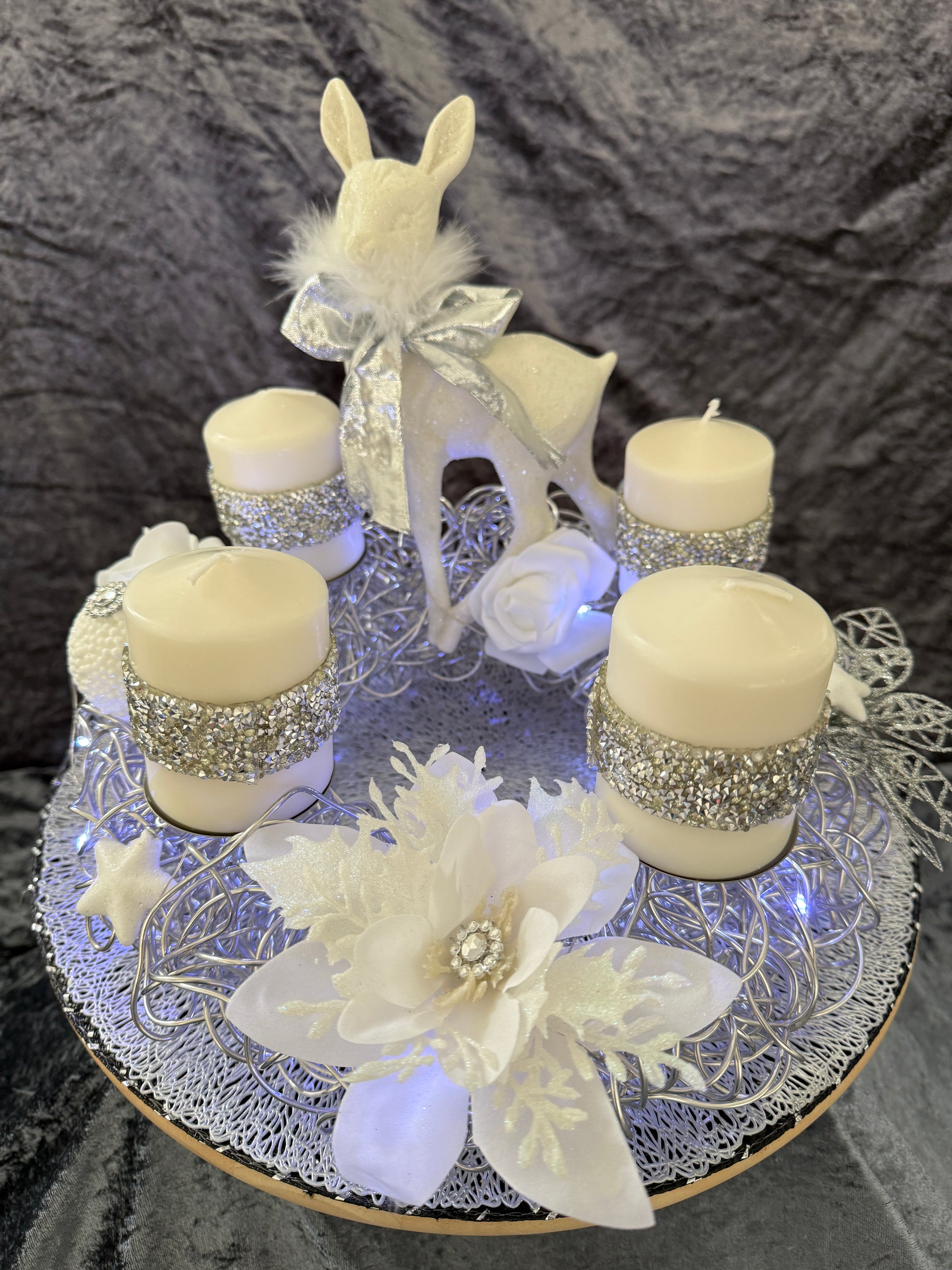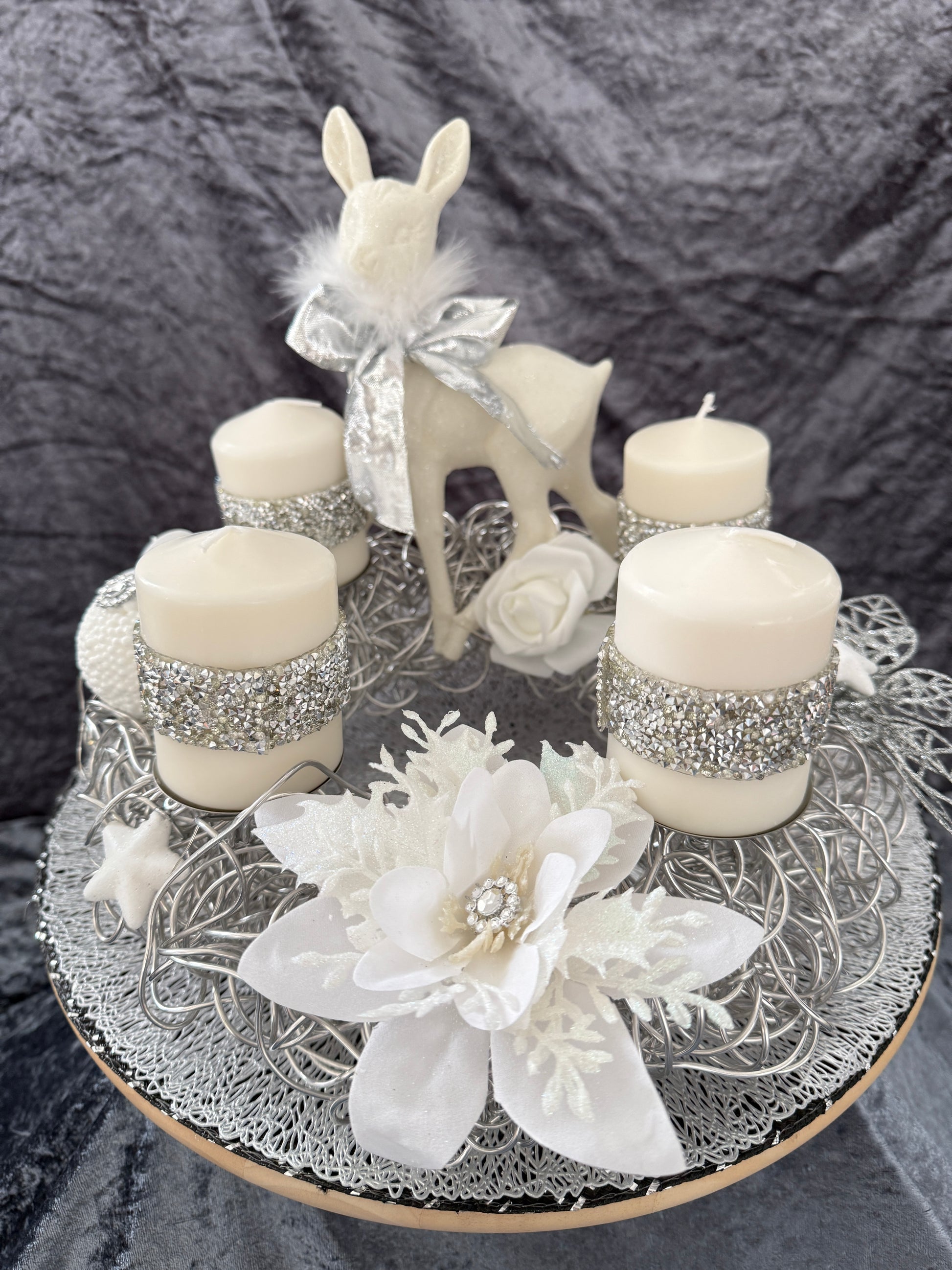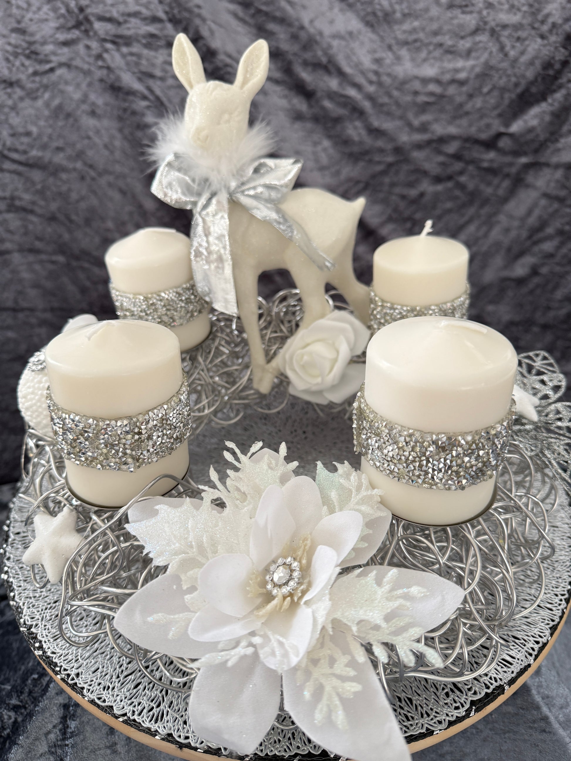 Dieser liebevoll gestaltete Adventskranz aus Aluminiumf misst ca .30 cm  und ist aus hochwertigen, Materialien hergestellt, was es zu einem langlebigen und pflegeleichten Begleiter in der Weihnachtszeit macht und jedes Jahr wieder verwendet werden kann.