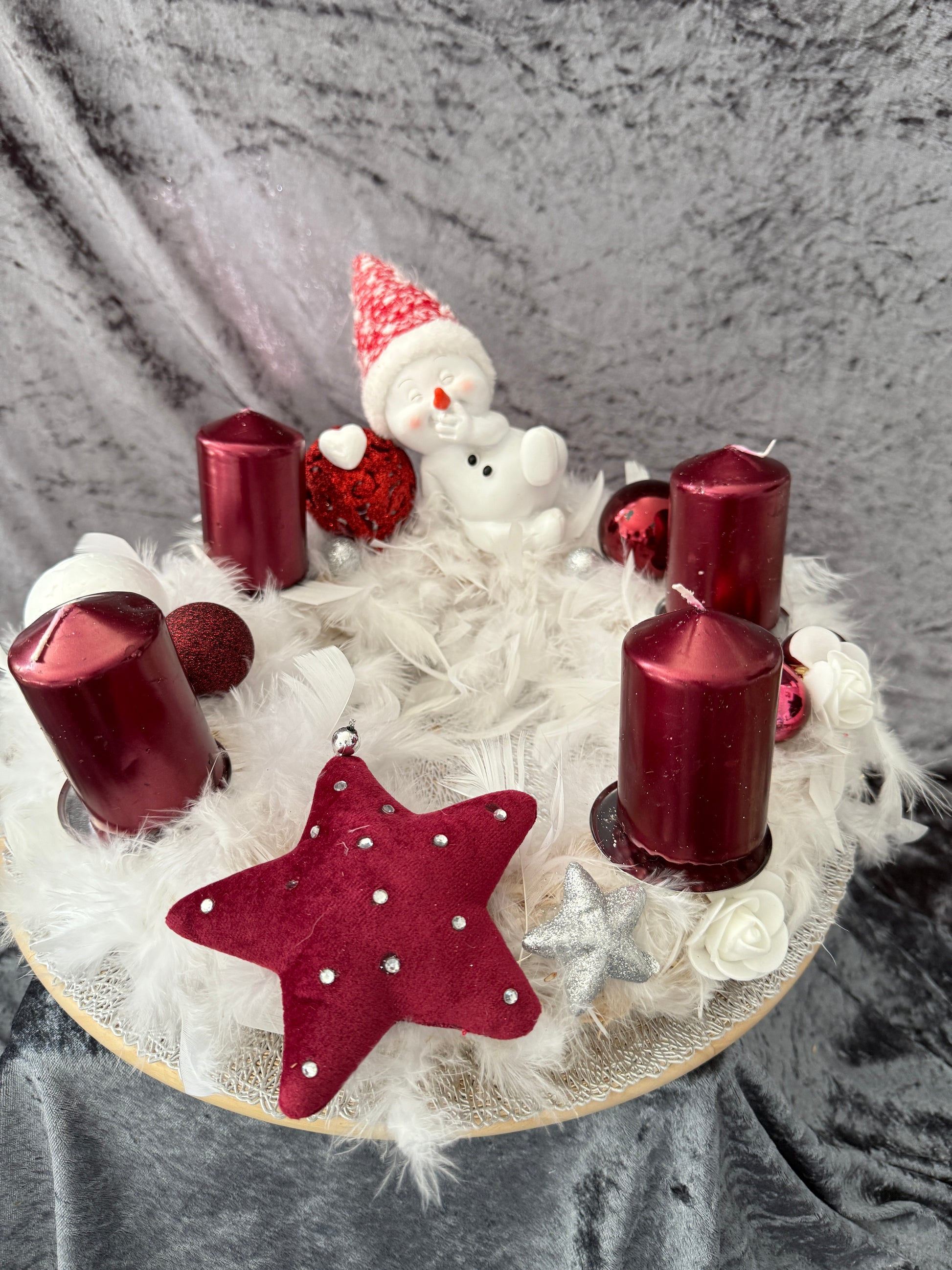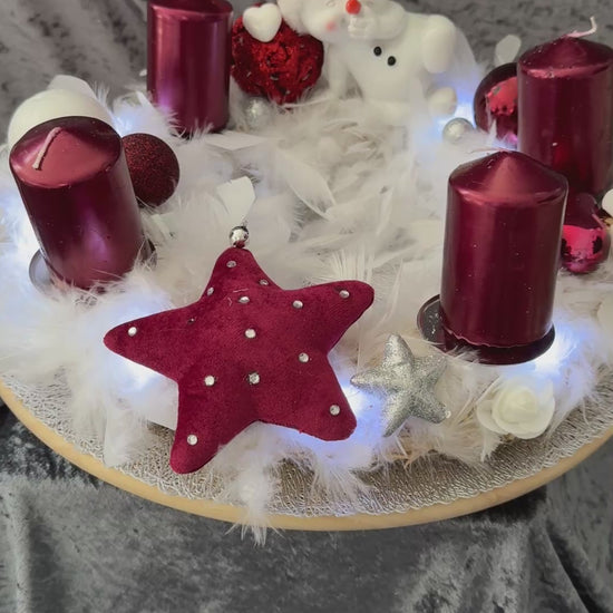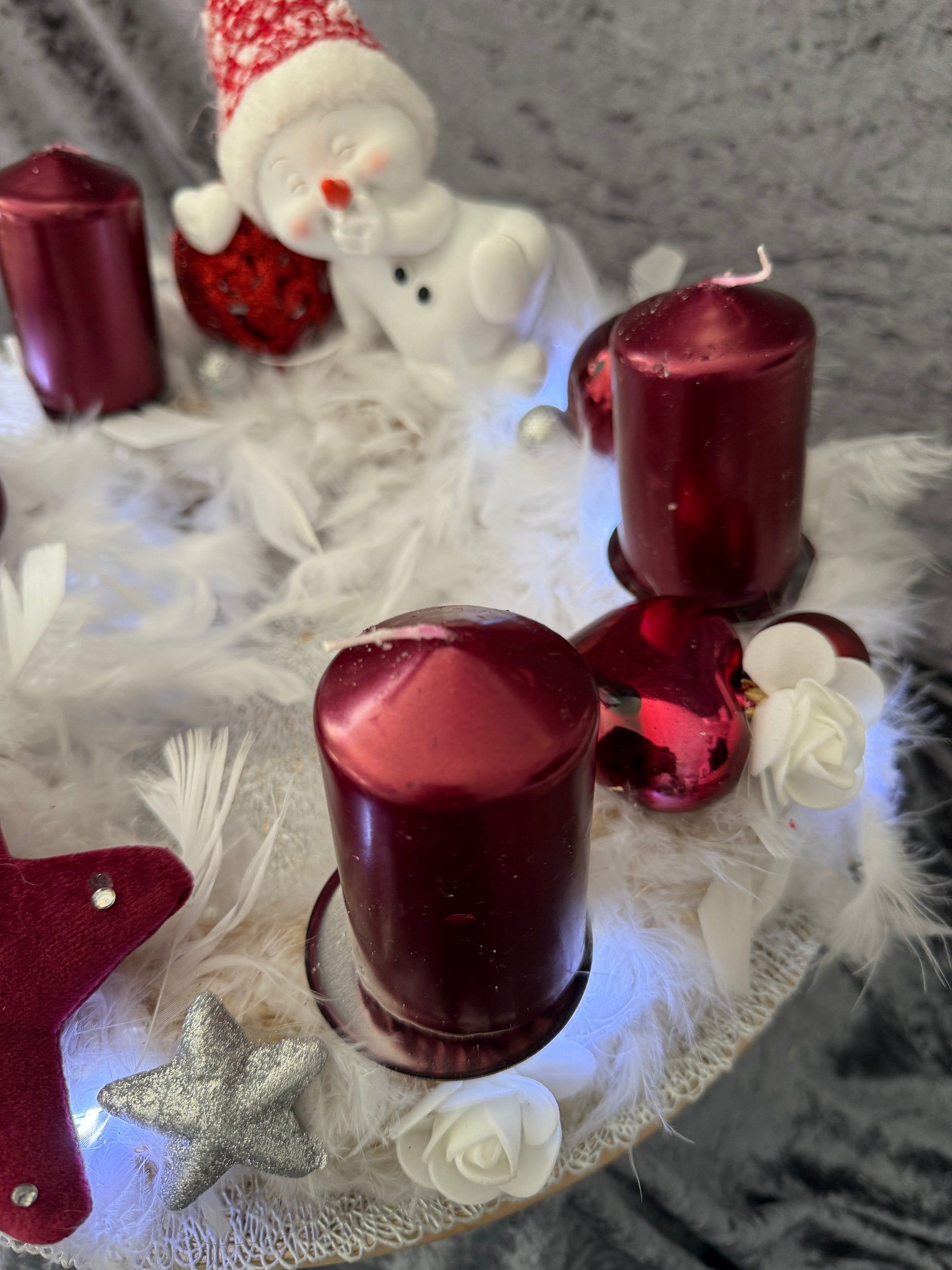 Dieses liebevoll gestaltete Adventsgesteck aus  Kunststoff misst ca .30 cm  und ist aus hochwertigen, künstlichen Materialien hergestellt, was es zu einem langlebigen und pflegeleichten Begleiter in der Weihnachtszeit macht und jedes Jahr wieder verwendet werden kann.