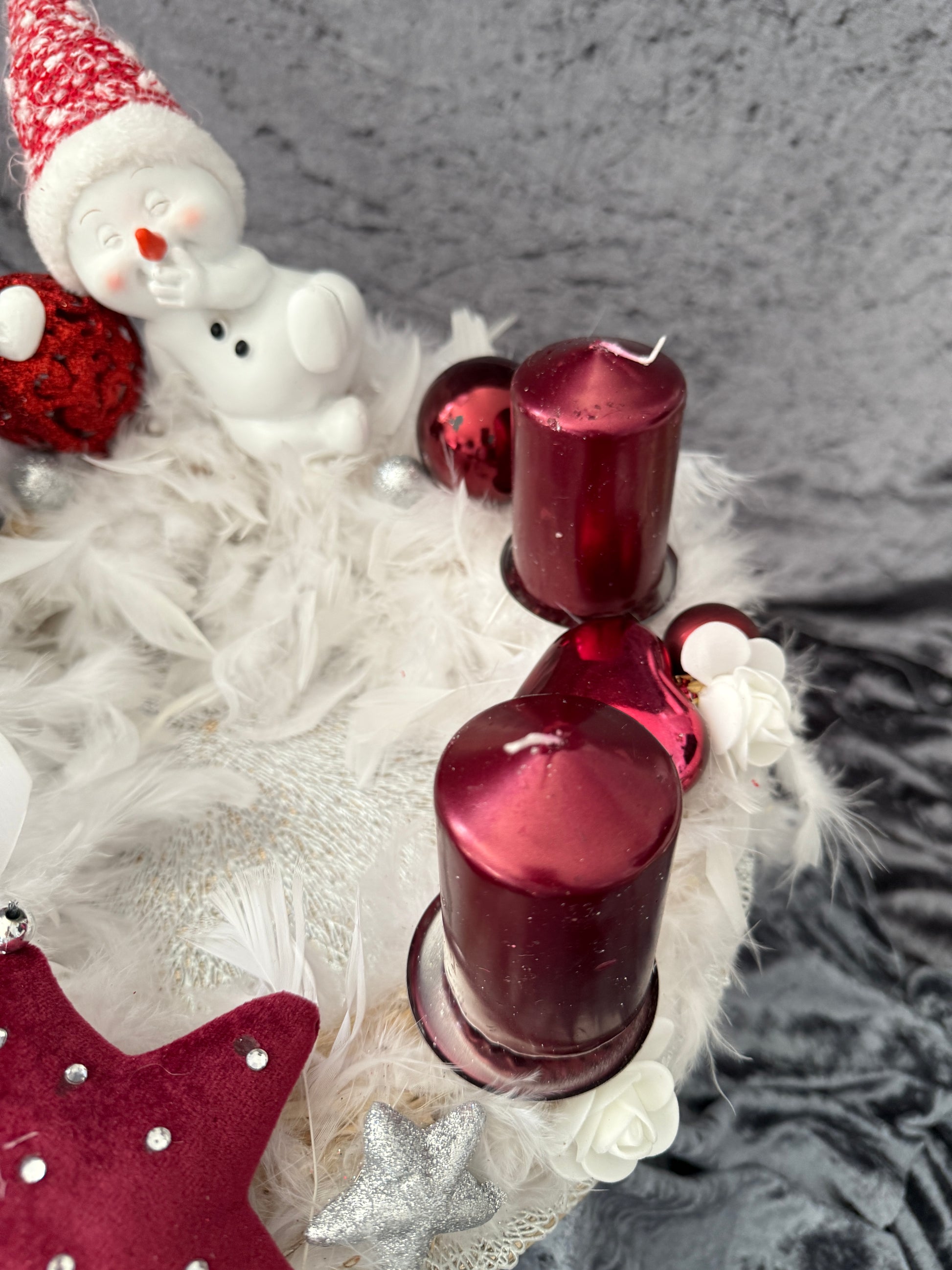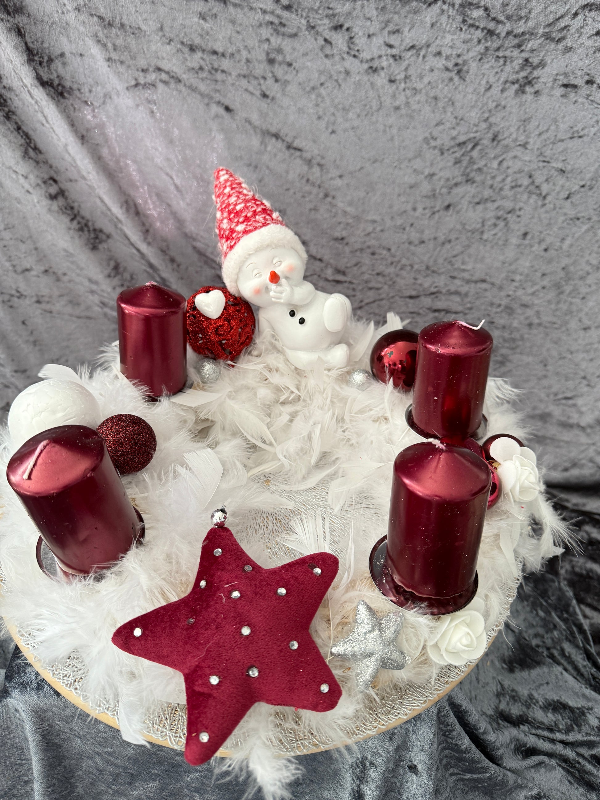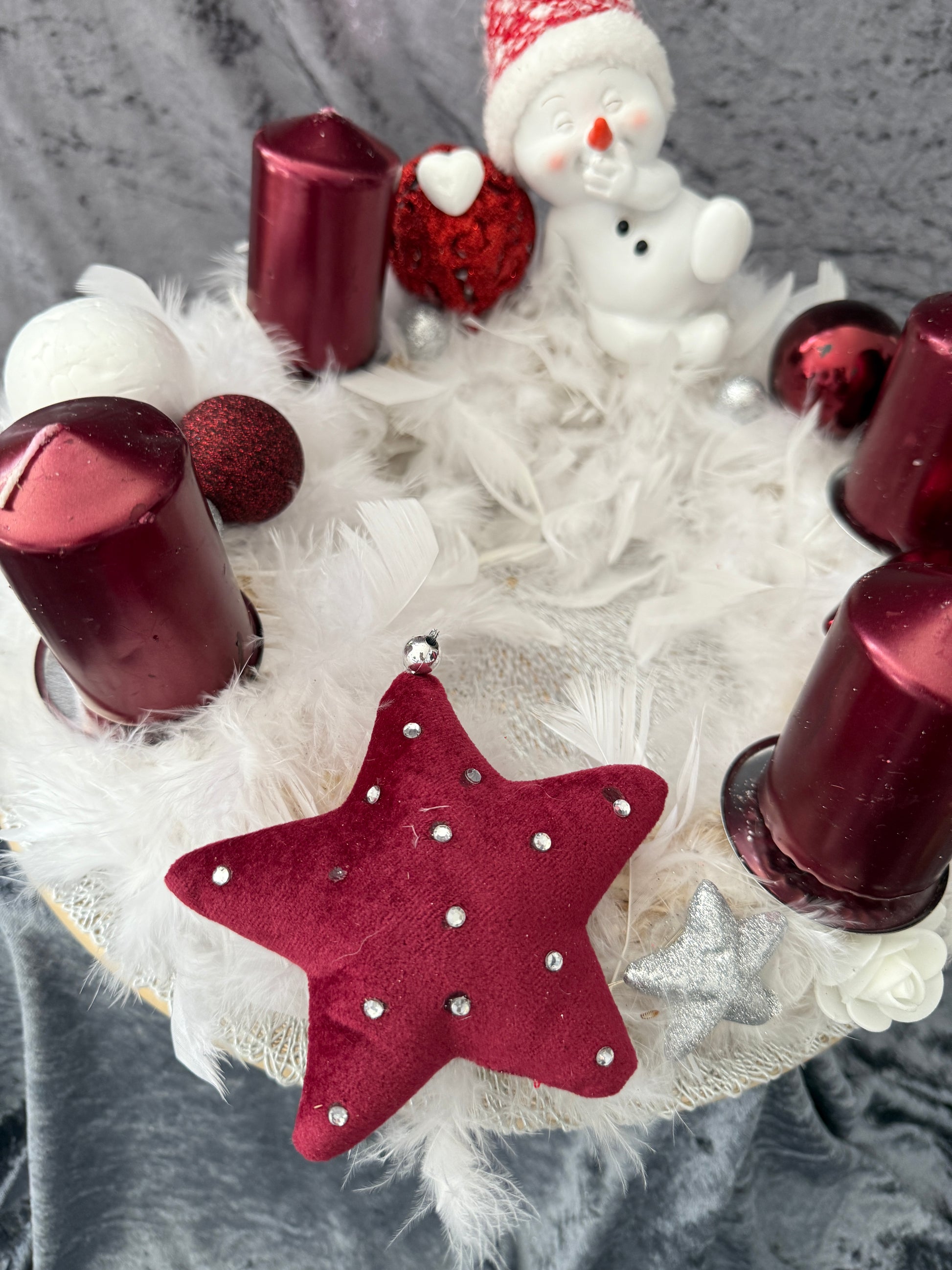 Dieses liebevoll gestaltete Adventsgesteck aus  Kunststoff misst ca .30 cm  und ist aus hochwertigen, künstlichen Materialien hergestellt, was es zu einem langlebigen und pflegeleichten Begleiter in der Weihnachtszeit macht und jedes Jahr wieder verwendet werden kann.