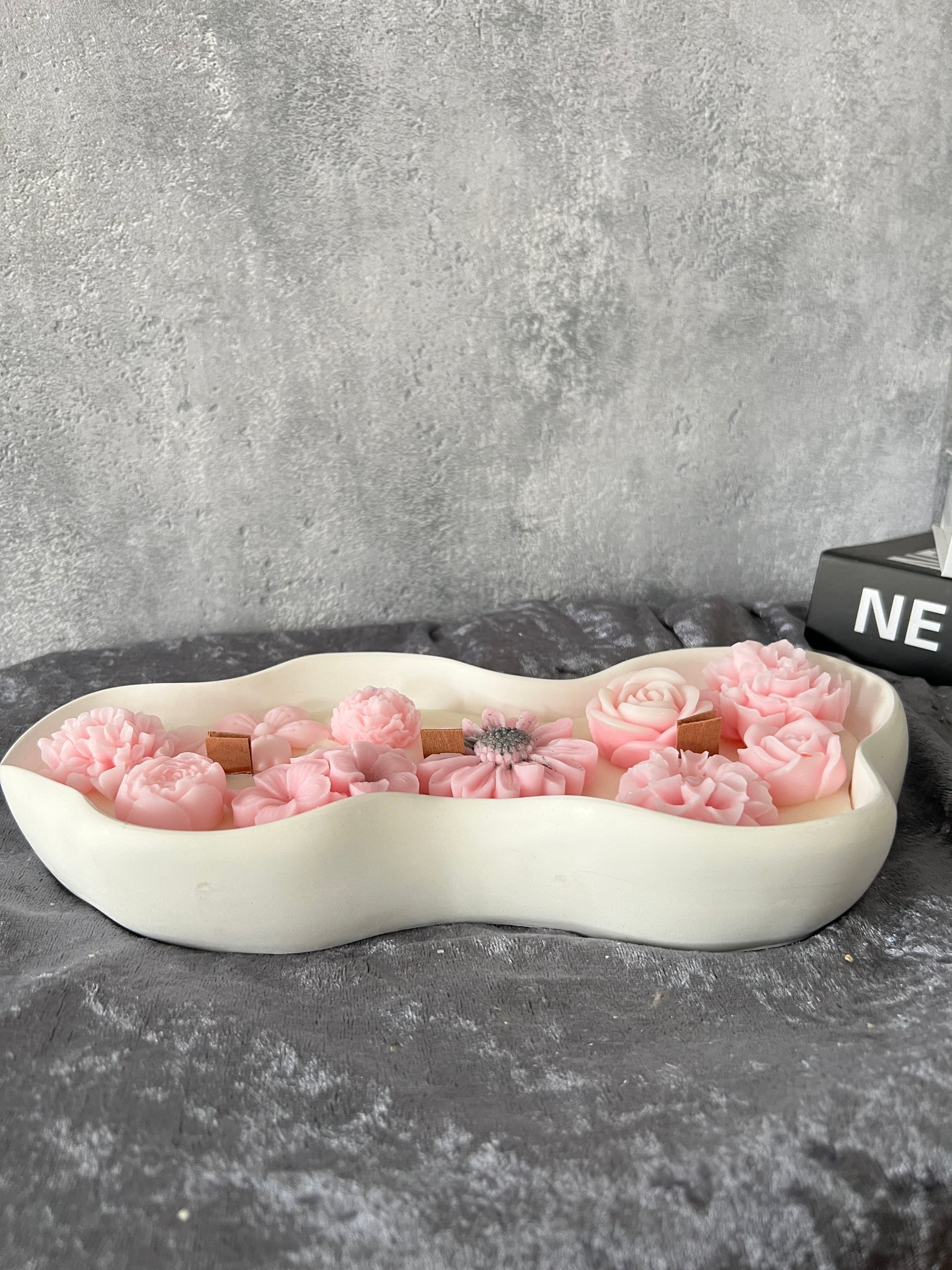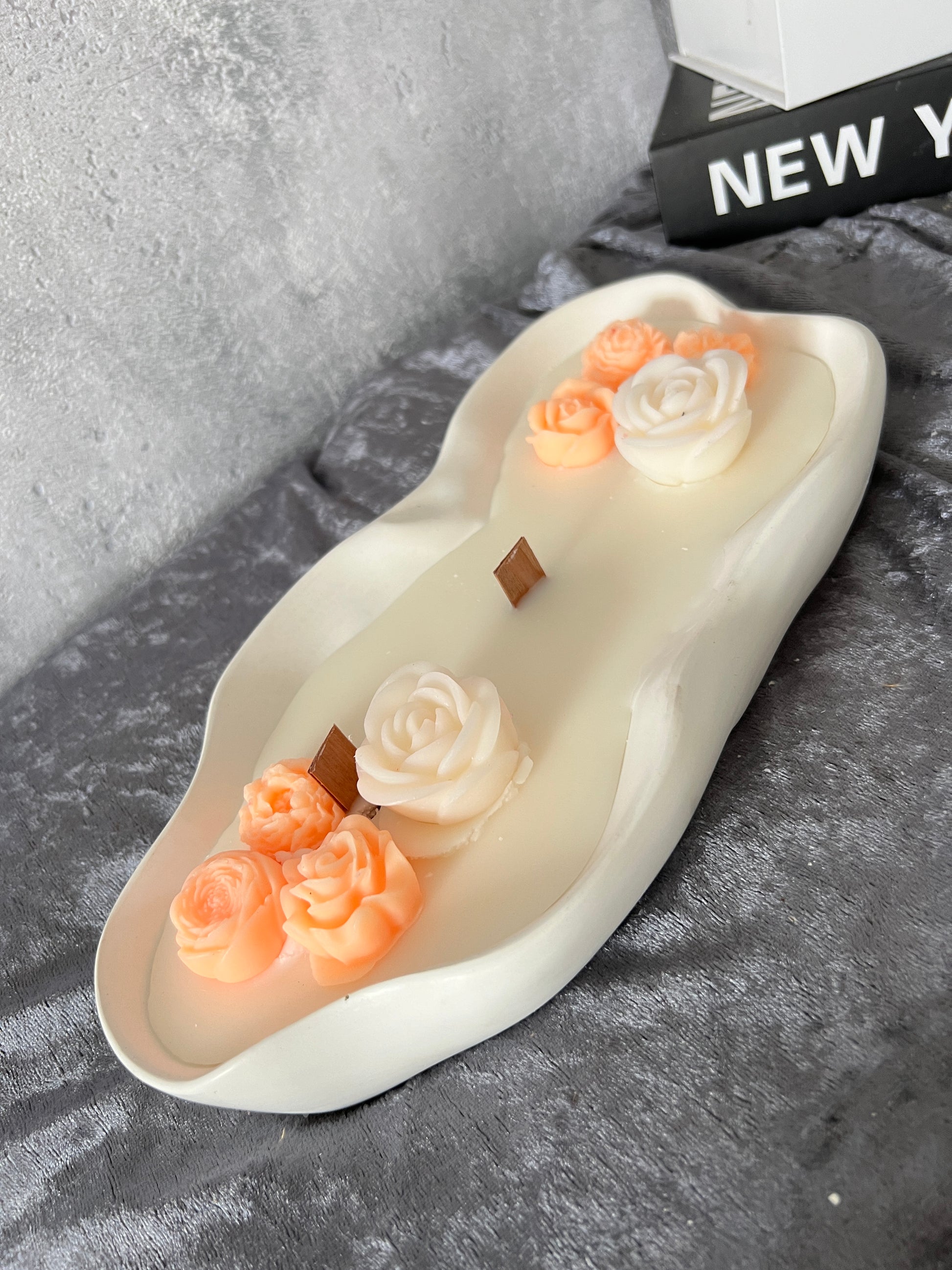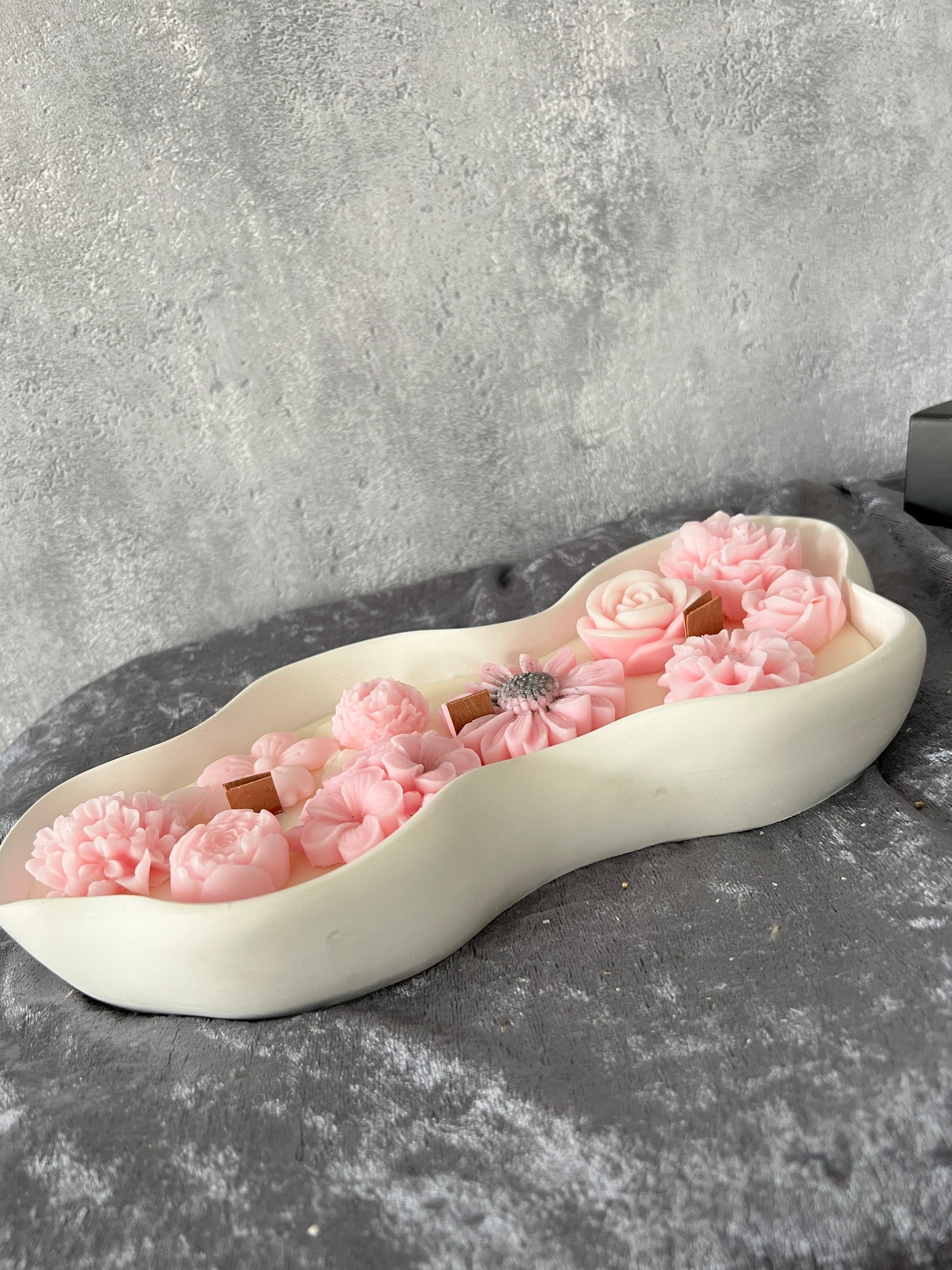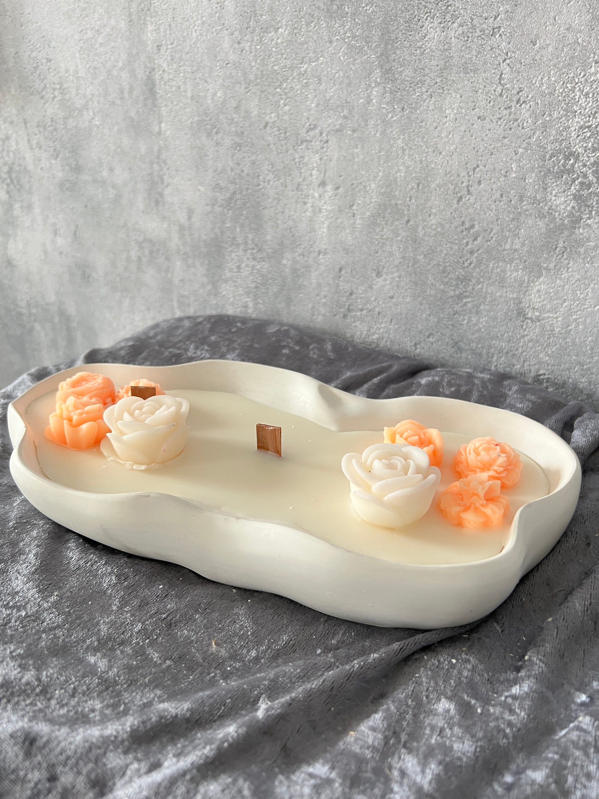 Eine wunderschöne ovale Kerzenschale aus selbstgegossenem Keramik mit Kerze aus Rapswachs.