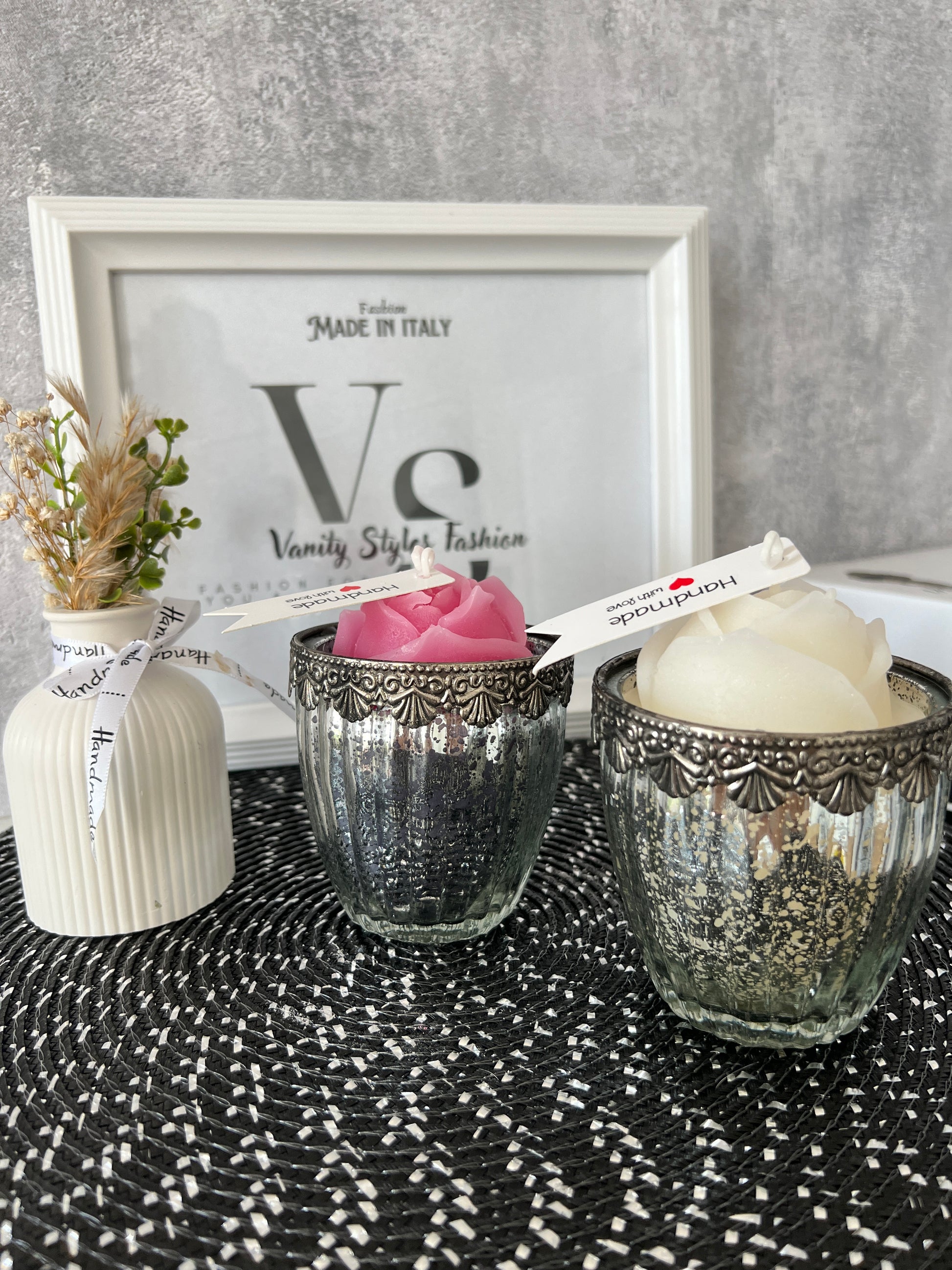 Das Glas ist in grau-silber Antik mit Metallverzierung, Eine große Rose rundet die Optik auf, möchtet ihr eine andere Farbe der Rose dann schreibt mir einfach.