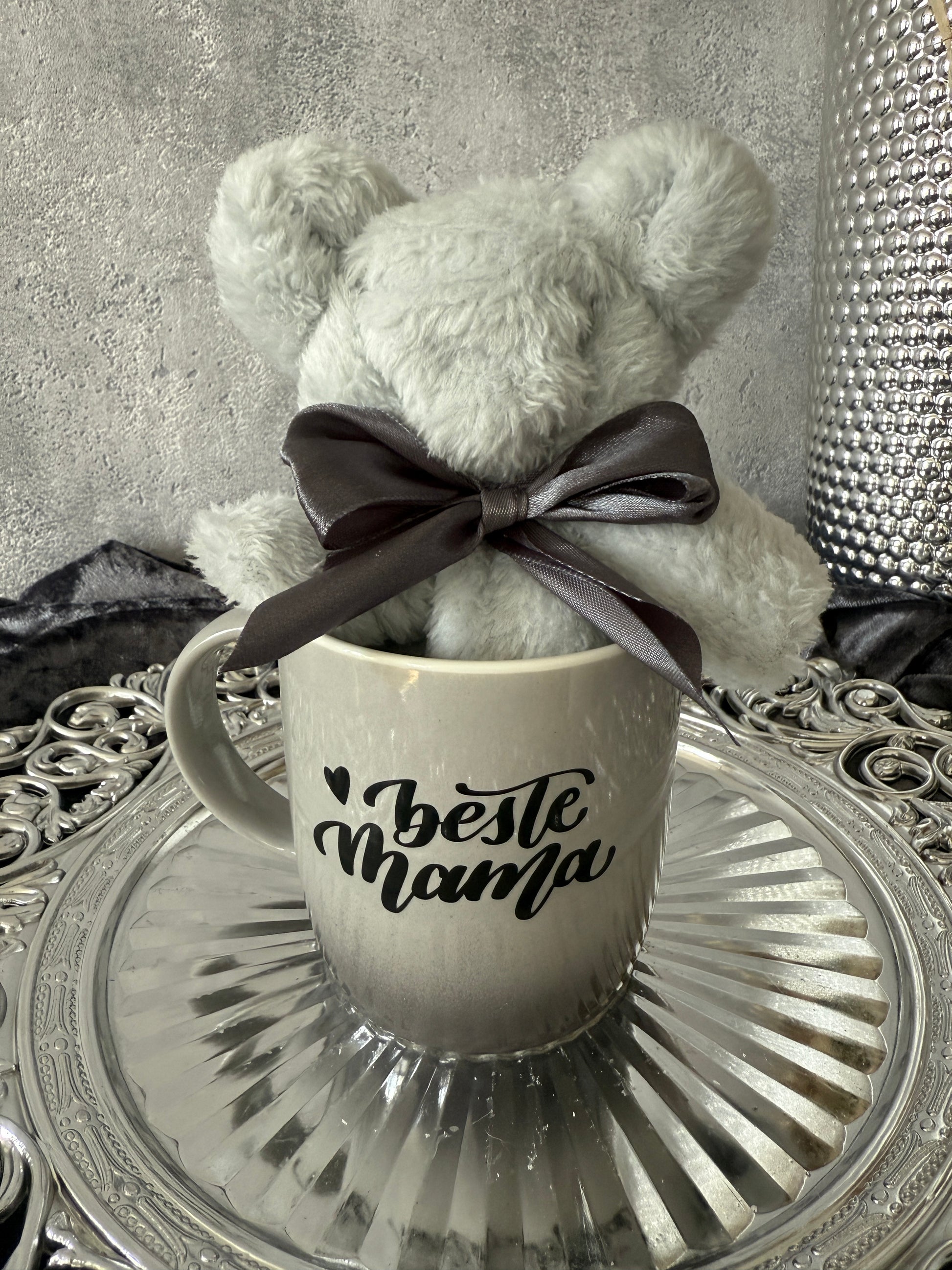 In jeder Tasse ein handgefertigter Teddy der geöffnet ein Handtuch ( Gästehandtuch ) ist. Eine so persönliche schöne Geschenkidee.